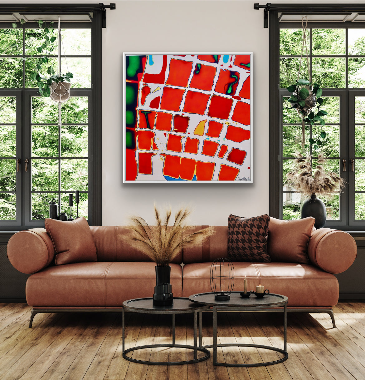 Static is a striking acrylic on canvas piece measuring 45”W x 45”H x 1.75”D, ready to hang. Created in 2022.