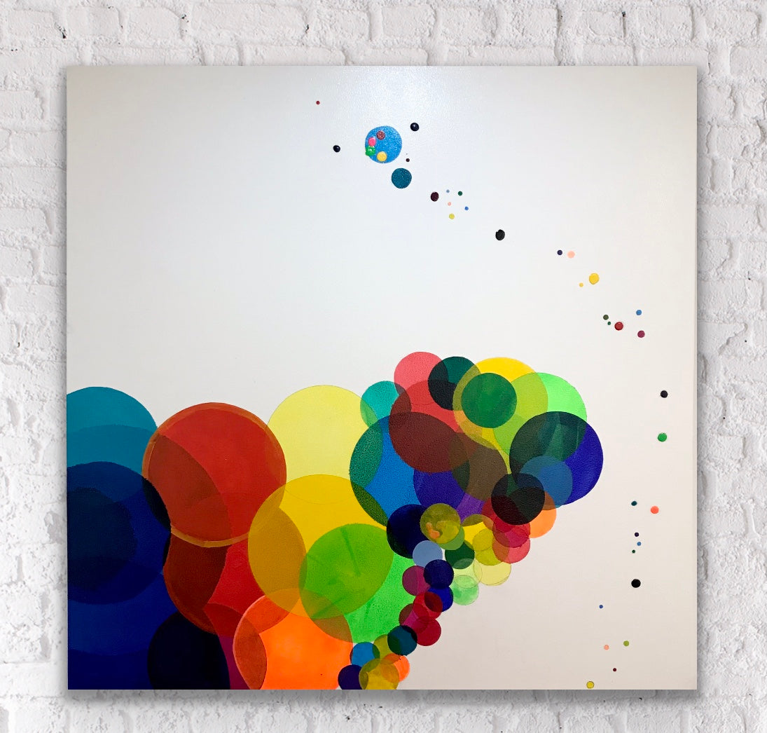 Elevated Senses is a captivating acrylic on canvas piece, measuring 45”W x 45”H x 1.75”D, created in 2022 as part of the "Cosmos" series.