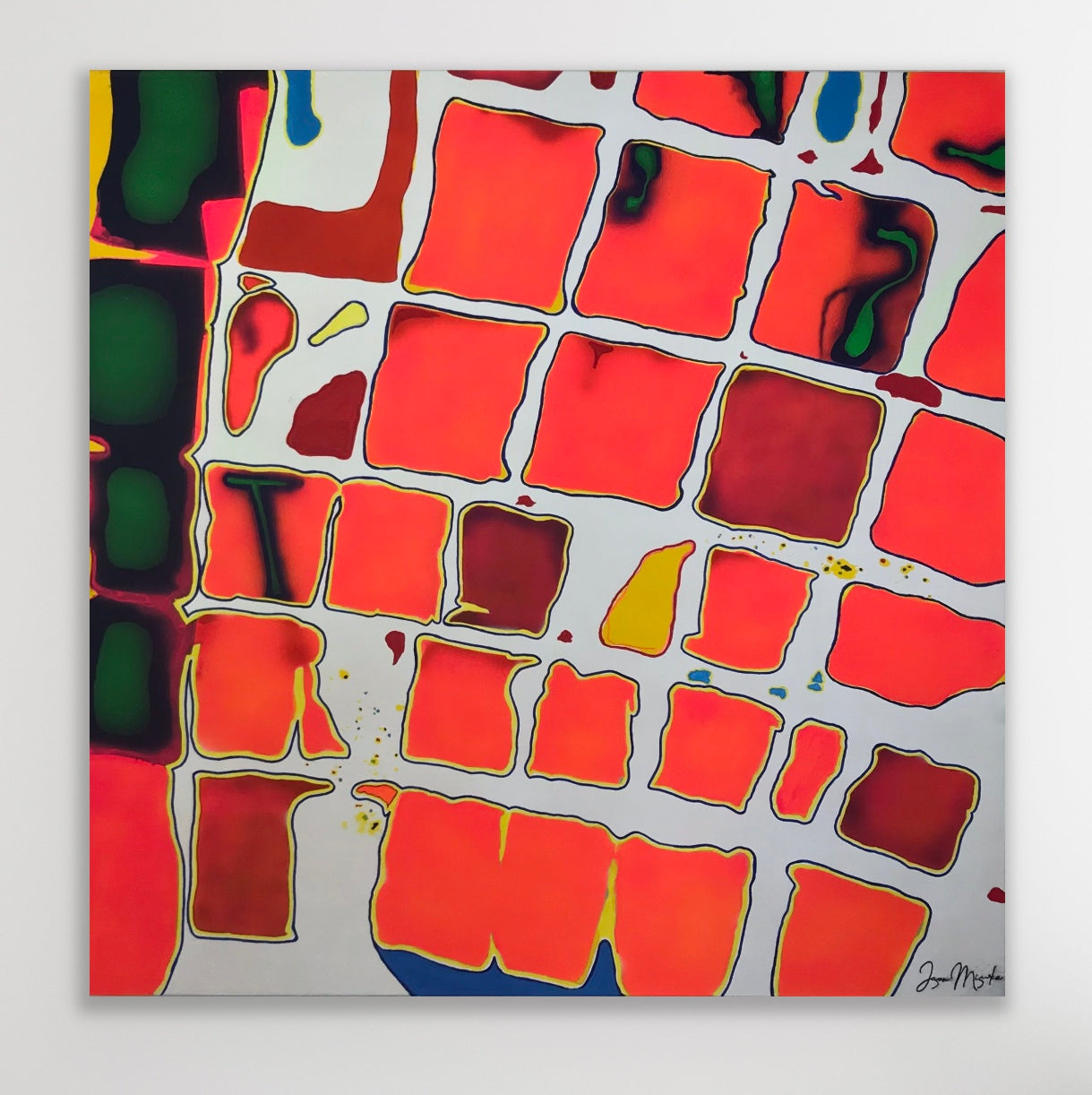 Static is a striking acrylic on canvas piece measuring 45”W x 45”H x 1.75”D, ready to hang. Created in 2022.
